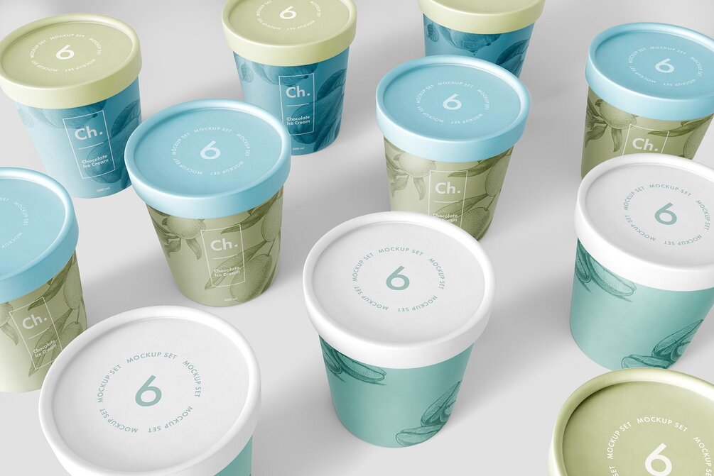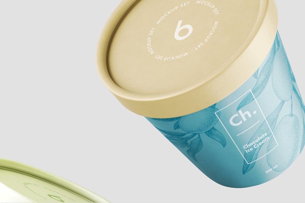 Ice Cream Jar Mockup. Inside you will find 6 pre-made PSD scenes. All objects and shadows are fully separated so you can easily play with them and create your own original custom scene. Also, you can easily increase or decrease the size, change color, background, etc. This mockup is suitable for ice cream, yogurt, and other food packaging. Jar Size 10,2x10,2x10,6cm (4x4x4,2in)