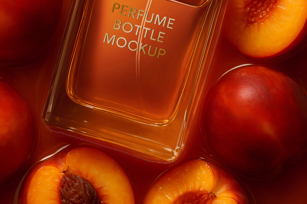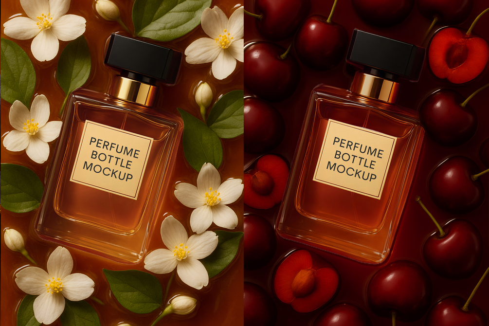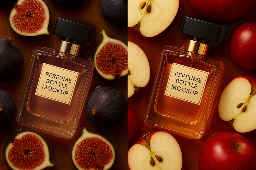 Bring your fragrance designs to life with this premium perfume bottle mockup collection. Each scene highlights the bottle surrounded by fresh fruits and delicate flowers – apples, berries, cherries, figs, jasmine, lime, and peaches – creating a vibrant and luxurious presentation.